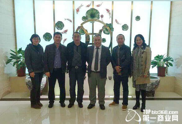 本网总裁黄华军(右二)、总编赖婉蕴(左一)、广州景豪坊购物中心总经理杨军艇(左三)、 广州国际采购中心有限公司国采总经理许一明(右三)、副总经理赵萍(右一)、梁湖(左二)合影。