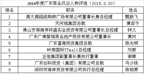 “2014年度广东商业行业卓越职业经理人”评选方面,广州五号停机坪商业经营管理有限公司总经理胡雨金的排名火速上升,跃至“亚军”,取代深圳睿商商业经营管理有限公司总经理张志的位置,奥园商业集团总裁苗思华奋起直追,首次“杀入”榜单。最新排名如下: