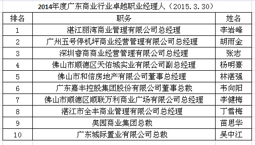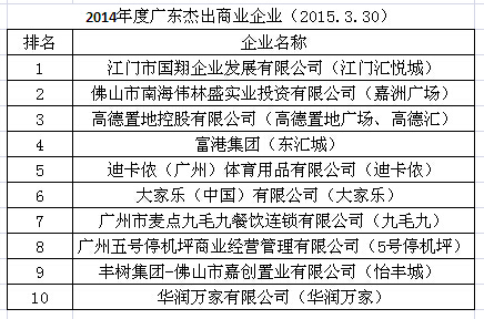 “2014年度广东杰出商业企业”评选方面,广州五号停机坪商业经营管理有限公司(5号停机坪)首次进入榜单,佛山市世纪东方物业经营管理有限公司(东方广场)则跌出十强榜。最新排名如下: