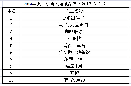 “2014年度广东新锐连锁品牌”评选方面,江湖情由上周的第七名攀升至第四名,博多一幸舍、乐凯撒比萨餐饮、细蓉小馆均相应下跌一名,有裕YOUYU则是首次晋级前十强。最新排名如下: