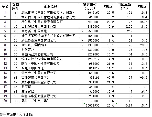 中国连锁经营协会3月25日正式公布“2009年主要海外品牌经营情况”表