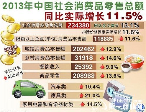 2013年中国社会消费品零售总额同比增11.5%
